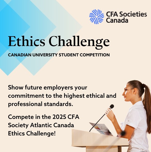 The CFA Societies Canada Ethics Challenge is designed to increase students’ awareness of the ethical dilemmas and issues they may face as investment management professionals. Teams consisting of students from finance or business programs (usually from CFA Institute’s University Affiliation Program) are given an ethics case to analyze and evaluate. Each team then presents its analysis and recommendations, to a panel of judges, selected by the host CFA Society.