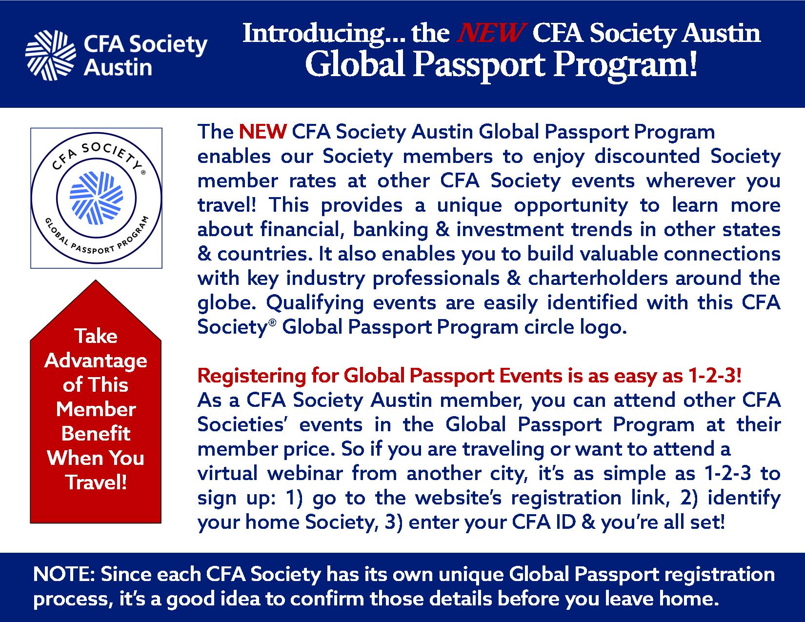 The Global Passport Program is a collaborative effort with the global network of CFA Societies to enhance local member benefits through shared programming.