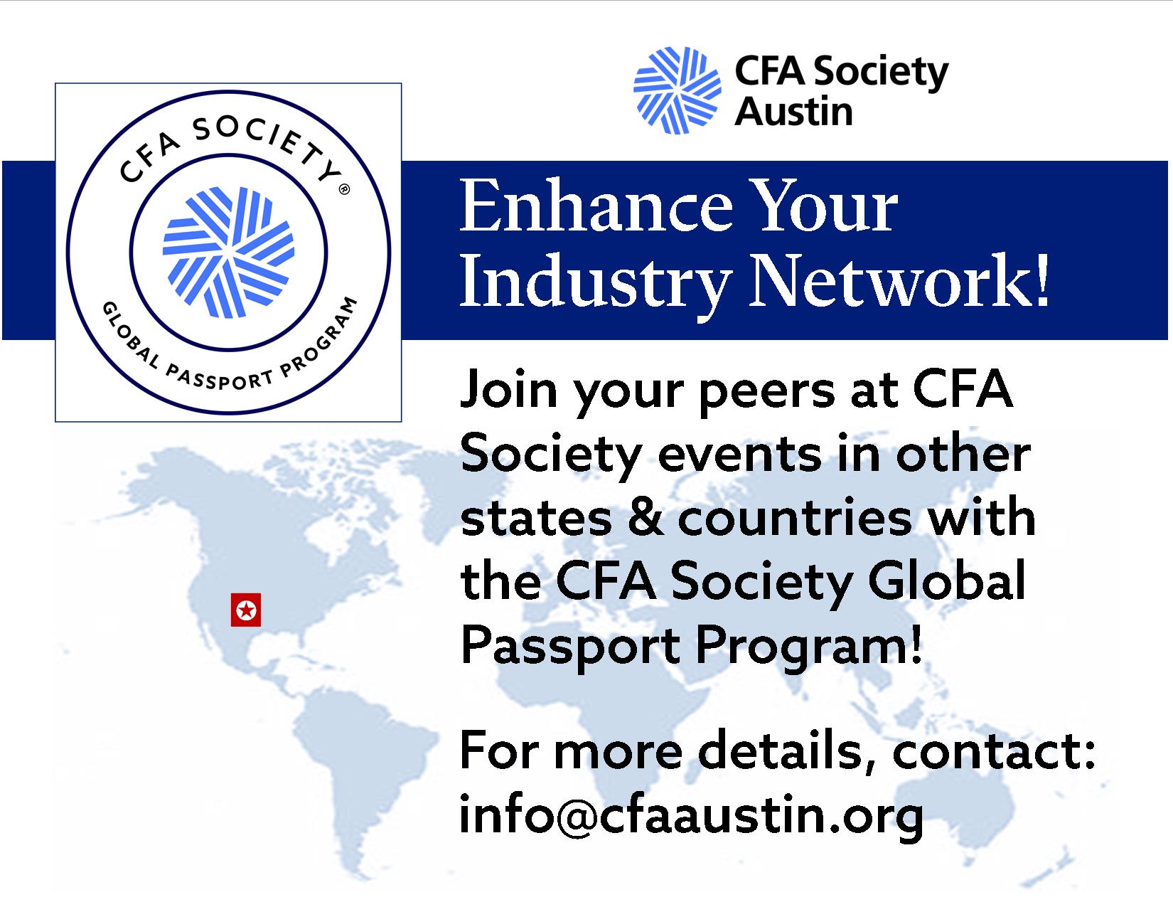 As a CFA Society Austin member, you are able to attend other CFA Societies’ events (that are also in the Passport Program) at local member rates. If you are traveling or want to attend a virtual webinar from another city, you can still plan for CFA in your weekly calendar!