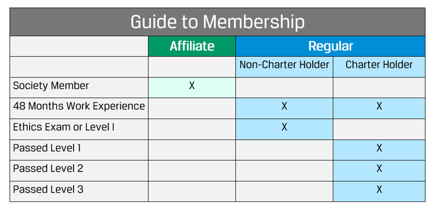 We recommend regular membership for candidates in the CFA program. The application process has three phases and typically takes several weeks to be approved. Regular membership requires: