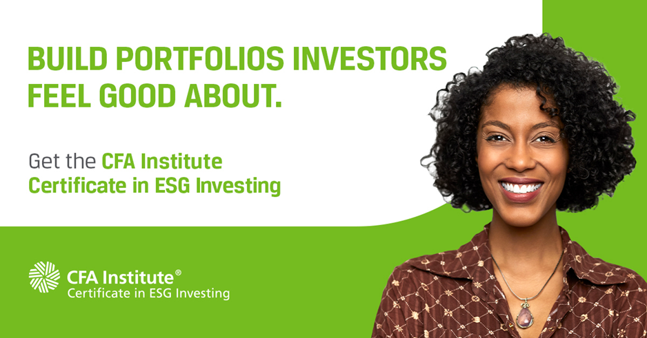 The CFA Institute Certificate in ESG Investing gives you the knowledge you need to manage investments with a focus on integrating environmental, social and governance factors. It can help you gain an edge in a fast-moving market.