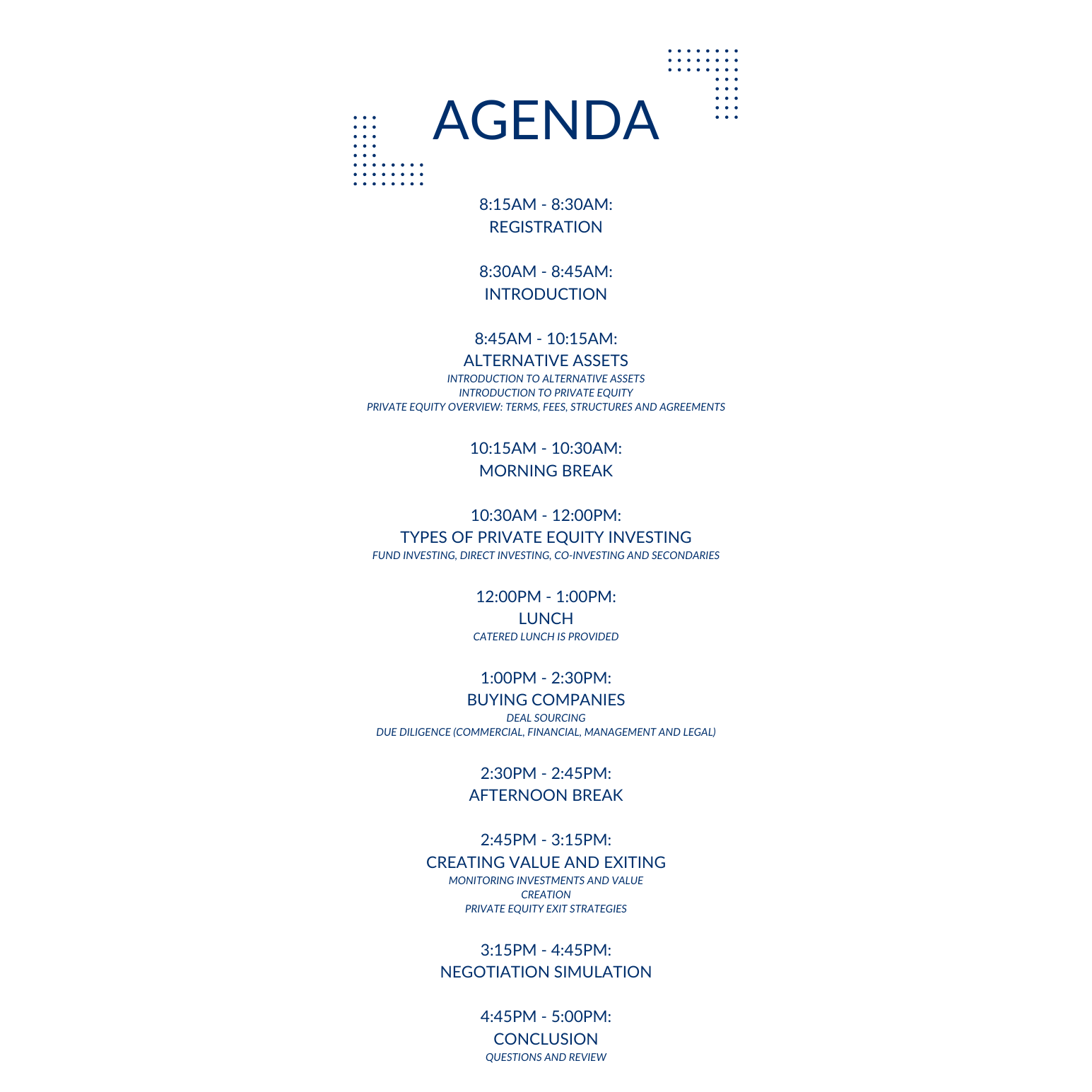 This one-of-a-kind, in-person Private Equity Bootcamp focuses on the knowledge and skills needed to invest in private equity and advise your clients on how to invest in private equity.