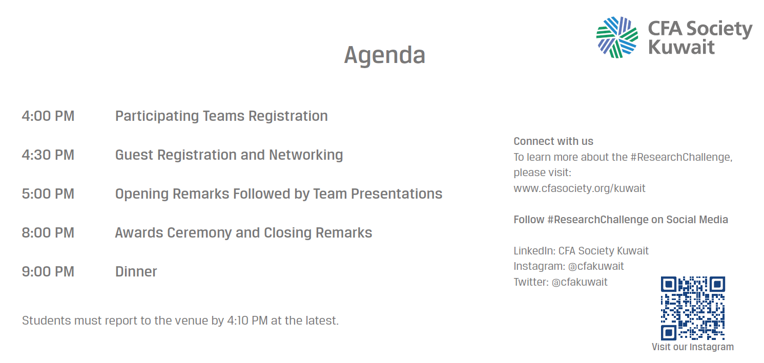 The CFA Institute Research Challenge is an annual global competition that connects university students with investment professionals from within the CFA Society® network. The competition provides students with hands-on mentoring and intensive training in financial analysis and ethics and tests participants' analytical, valuation, reporting writing, and presentation skills.