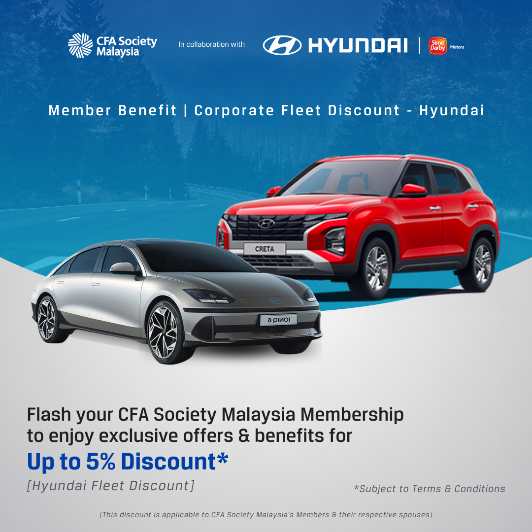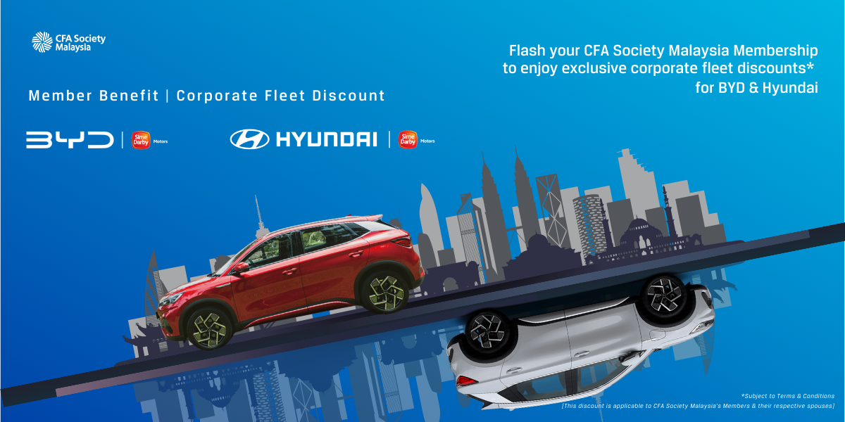 As we are committed to continually enhancing the value of your membership, we are excited to announce CFA Society Malaysia Member Benefits Offerings #4 - the BYD & Hyundai Corporate Fleet Discount in partnership with Sime Darby Motors Malaysia.