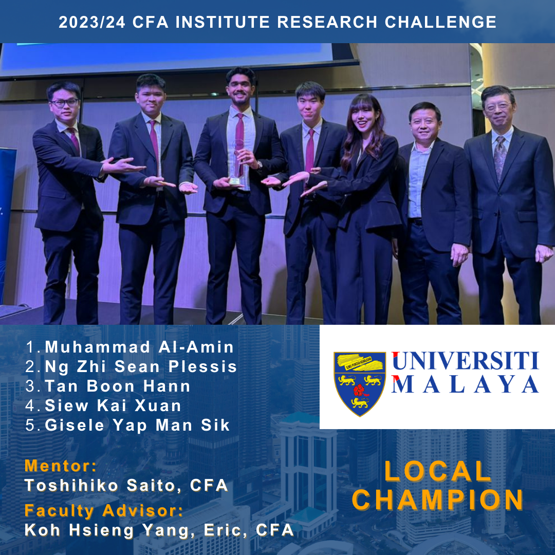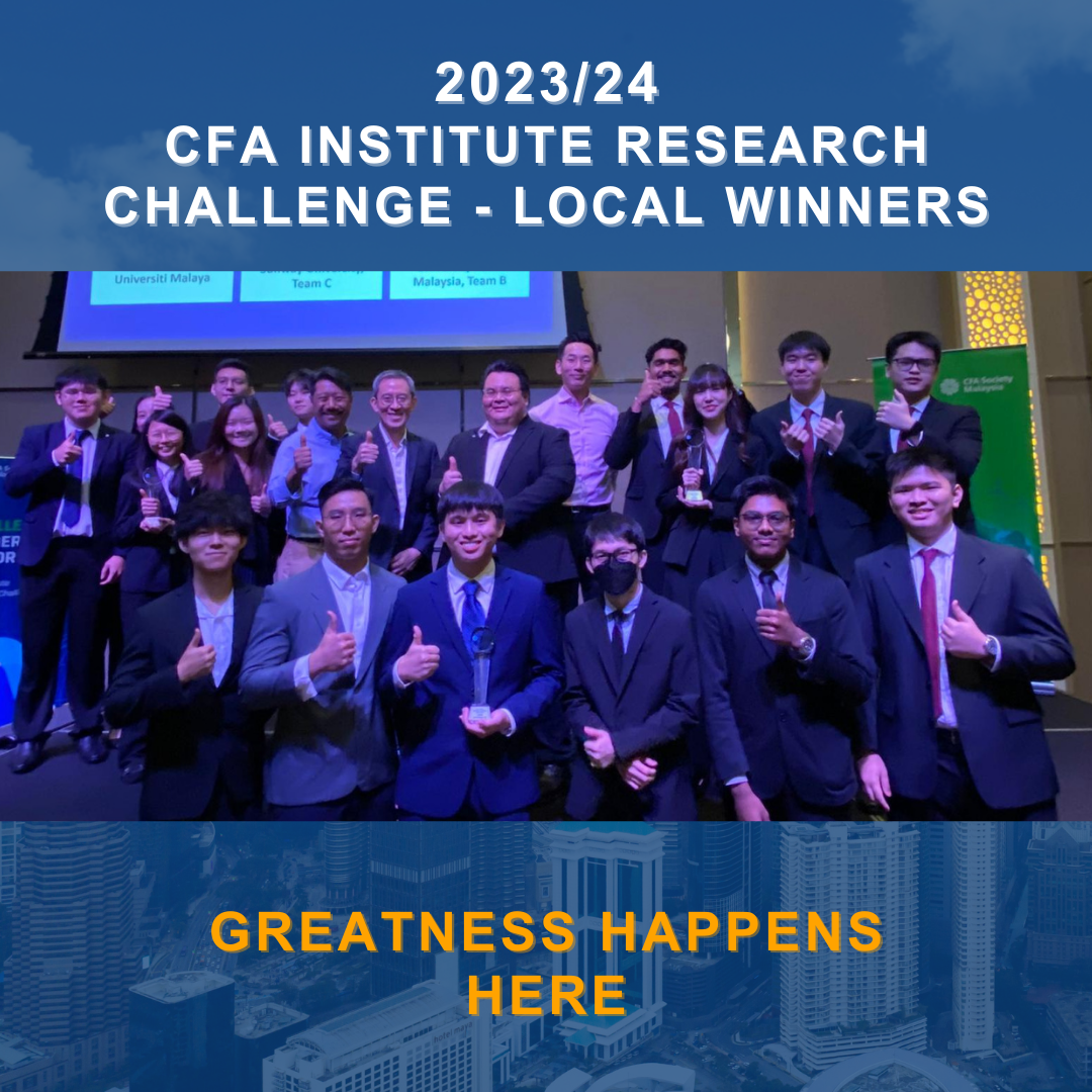 The CFA Institute Research Challenge 2023/24 Local Final Competition concluded successfully on Saturday, 24 February 2024, showcasing exceptional talent and dedication from the future of our industry professionals. Among the top contenders were teams from Universiti Malaya, Sunway University, and University Putra Malaysia who won the local prizes. Their outstanding performance exemplifies the high caliber of participants in this prestigious event. Congratulations to the Top 2 teams from University Malaya and Sunway University who emerged as after rigorous rounds of analysis and presentation. Congratulations to all the teams for their remarkable achievement!