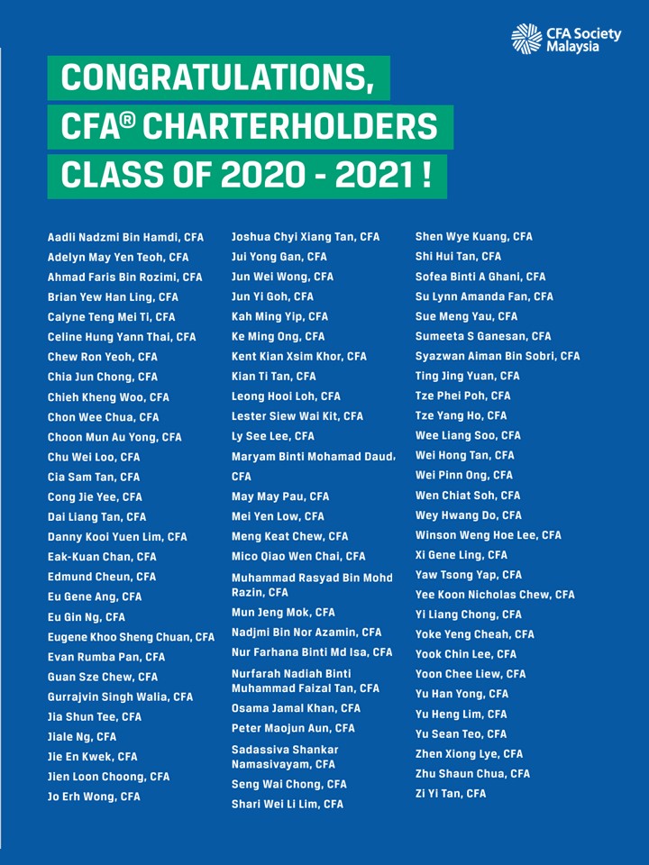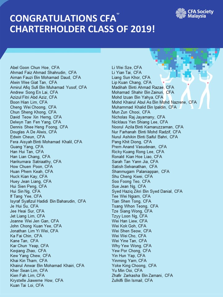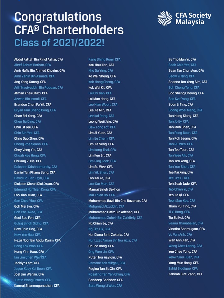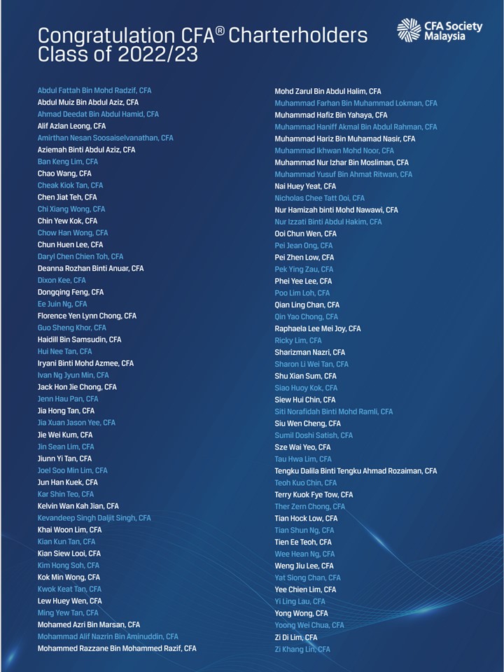 Honoring the 105 candidates who successfully completed the CFA® Programme and earned their CFA Charters between May 4, 2023, and May 4, 2024. These new Charterholders join the esteemed ranks of CFA Society Malaysia, now with over 980 distinguished members, signifying their commitment, dedication, and perseverance in achieving this prestigious qualification.