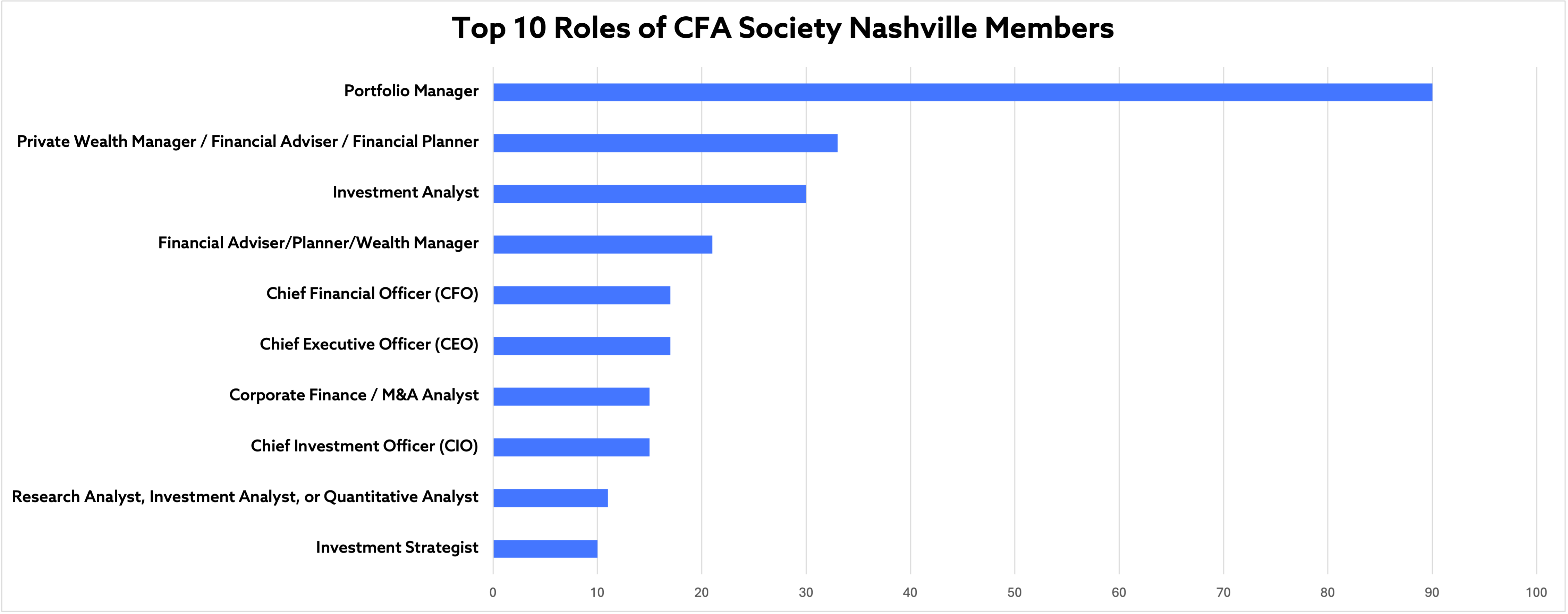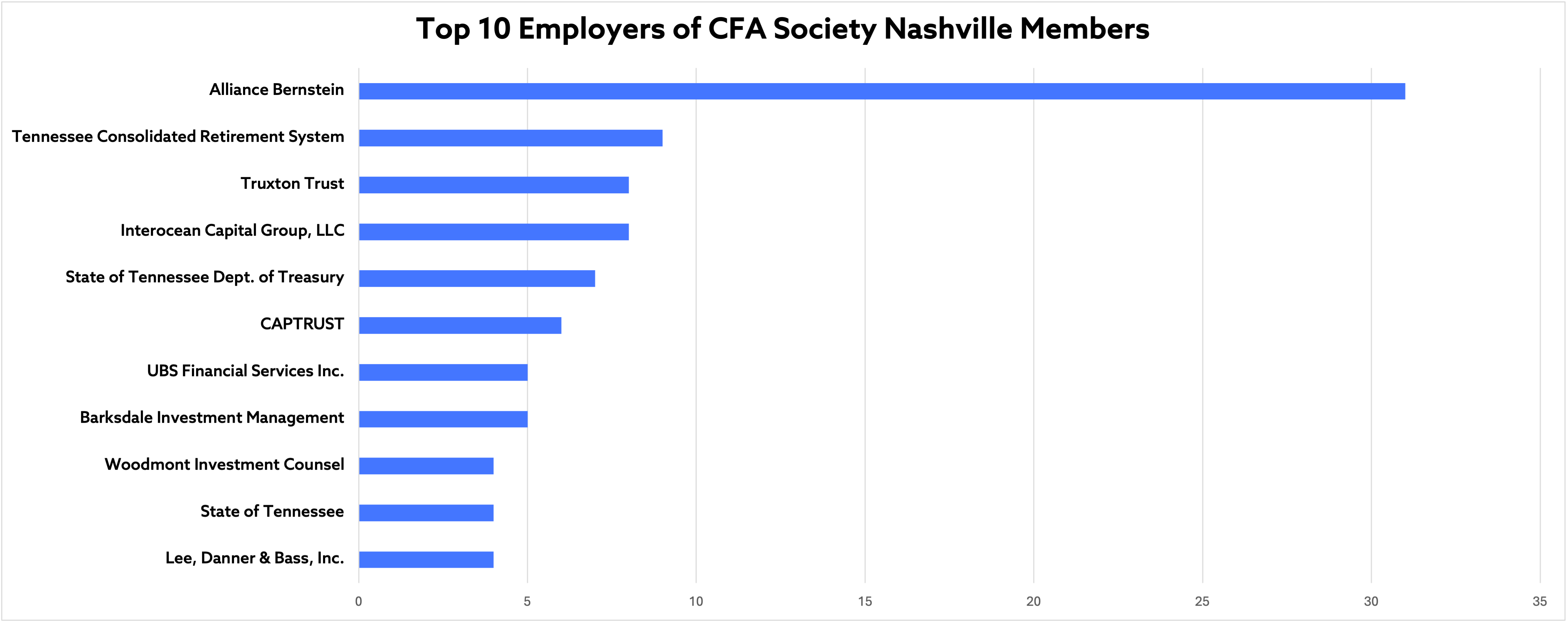Our member base is responsible for or helps to manage billions in client's assets. Per CFA Institute statistics, 65 CFA Society Nashville members work for firms with assets under management in excess of $1 billion.