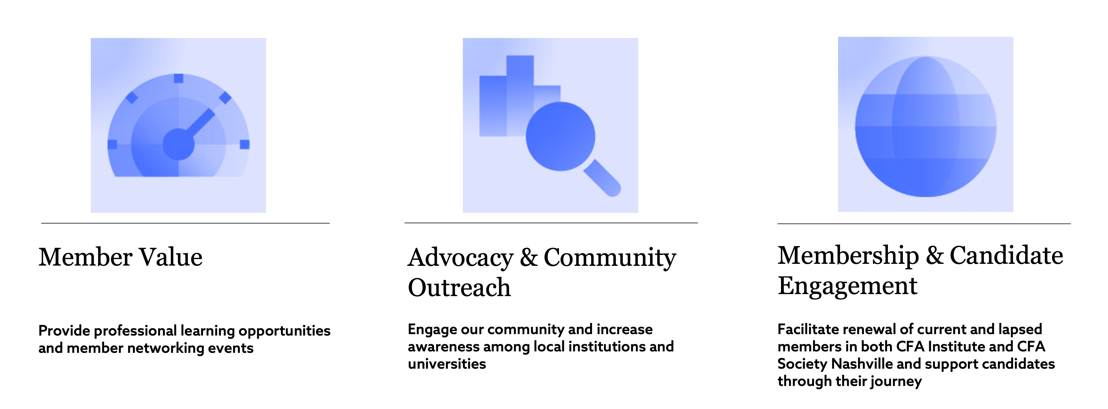 Our mission is to equip members to be leaders in our community by promoting the value of the CFA designation and facilitating the exchange of ideas and resources for the ultimate benefit of Middle Tennessee.