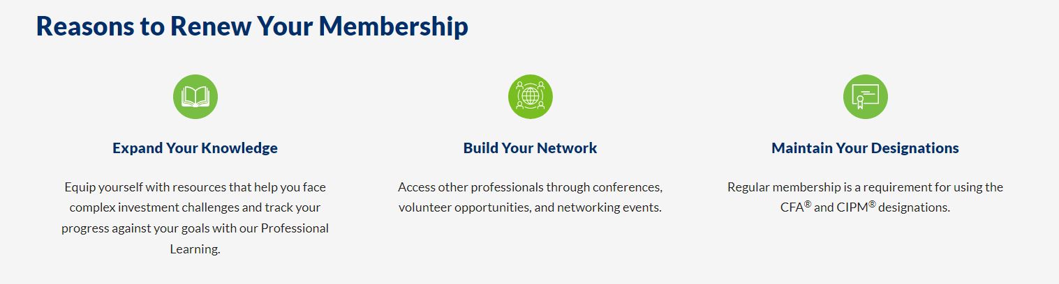 Regular Membership is for investment professionals directly involved in or supporting the investment decision-making process. Regular membership is a prerequisite to earning the CFA charter and CIPM certificate.