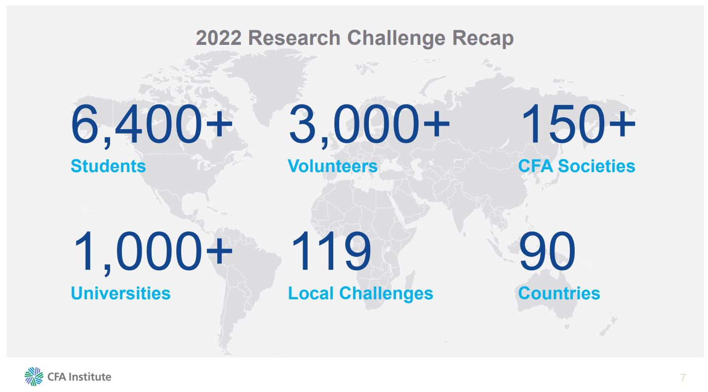 The CFA Institute Research Challenge is an annual global competition that connects university students with investment professionals from within the CFA Society® network. The competition provides students with hands-on mentoring and intensive training in financial analysis and ethics and tests participants' analytical, valuation, reporting writing, and presentation skills.