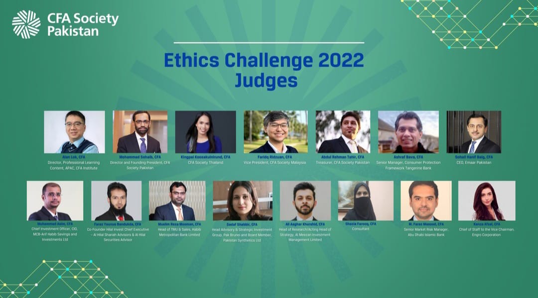 The CFA Society Pakistan Ethics Challenge embodies the mission of CFA Institute by promoting the highest standards of ethics, education, and professional excellence. It focuses on many of the elements of CFA Institute's Future of Finance initiative: Transparency and FairnessRegulation and Enforcement and Safeguarding the System. Equally important, it helps prepare those entering the investment profession for the ethical challenges that they will face in the workplace.