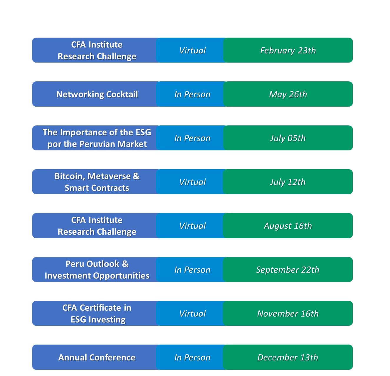 El CFA Society Perú se complace en presentar los eventos e iniciativas que el directorio de nuestra asociación ha llevado a cabo durante el año 2022.