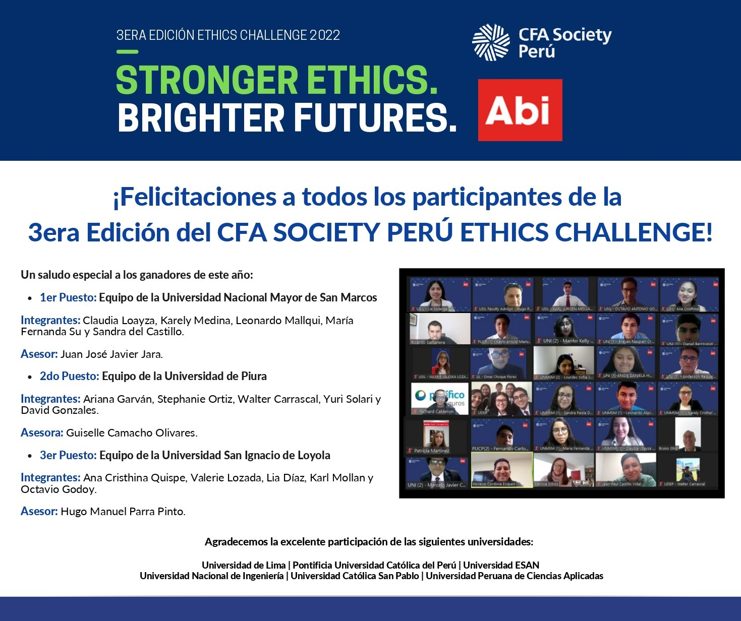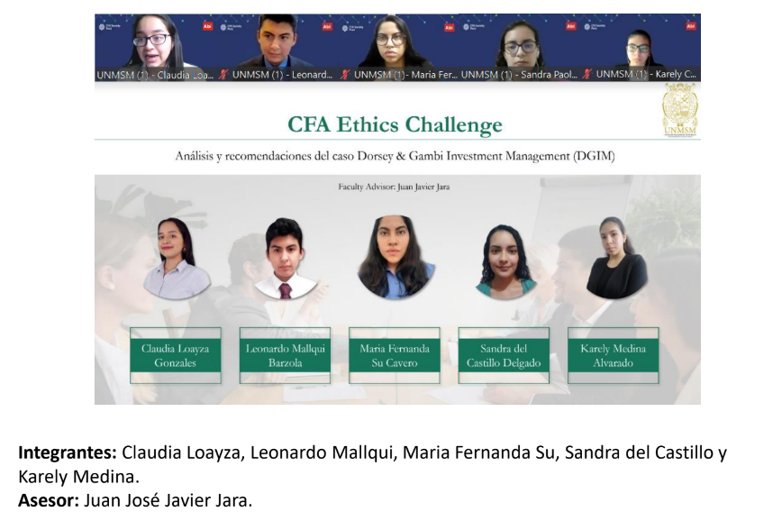 El CFA Society Perú Ethics Challenge 2023 es una competencia entre equipos de distintas universidades peruanas en la que se debe analizar un caso de estudio con dilemas éticos y violaciones al CFA Institute Code of Ethics and Standards of Professional Conduct.