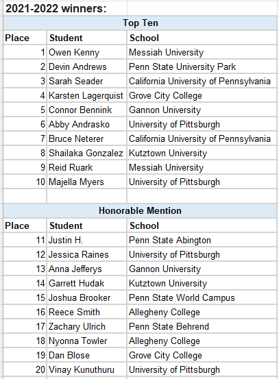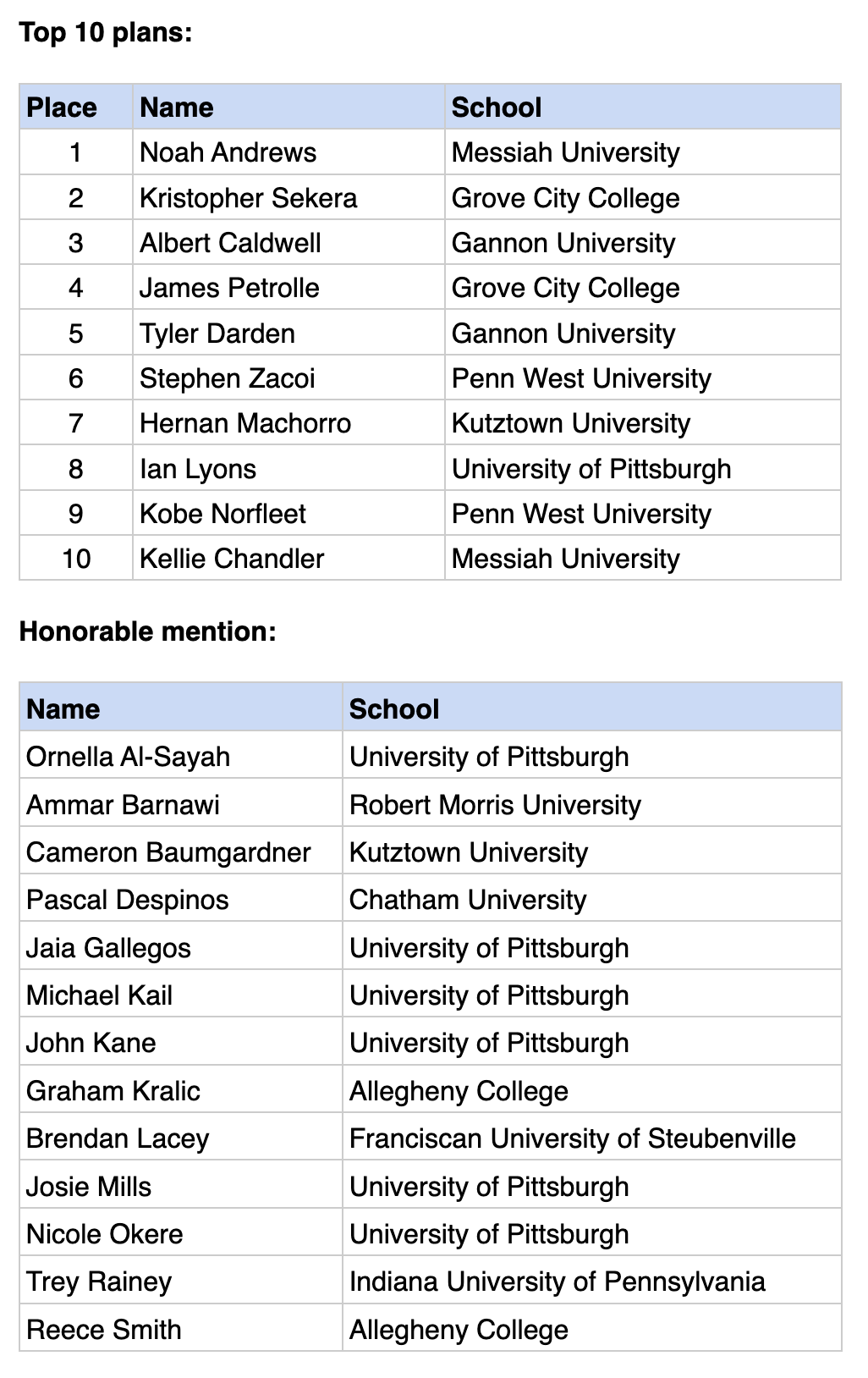 New in 2023, we are proud to welcome the Financial Planning Association of Pittsburgh (FPA) and CFA Society Philadelphia as partners in administering the competition.