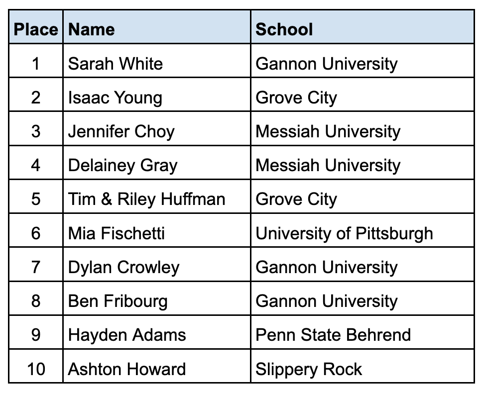 - University of Pittsburgh has the most Top-10 finishers (24 total).