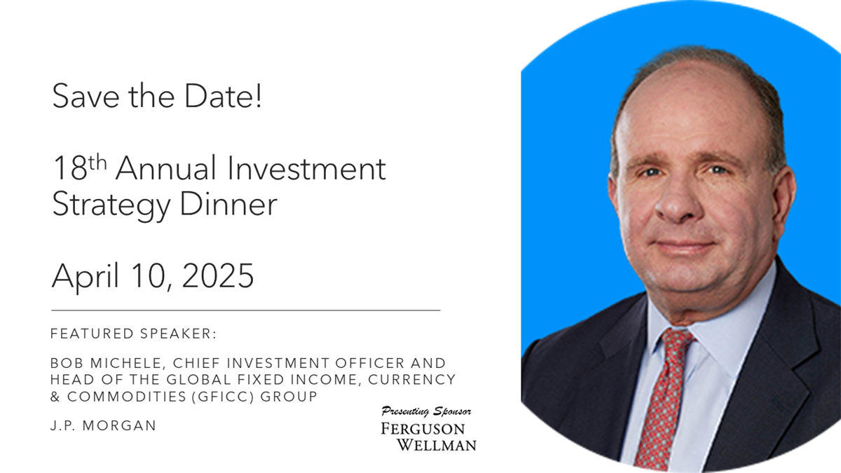 Join CFA Society Portland for the Eighteenth Annual Investment Strategy Dinner with Bob Michele, Chief Investment Officer and Head of the Global Fixed Income, Currency & Commodities (GFICC) Troup of J.P. Morgan, on Thursday, April 10, 2025, at the Portland Art Museum. Don’t miss Portland’s premier investment strategy event. More information coming soon!