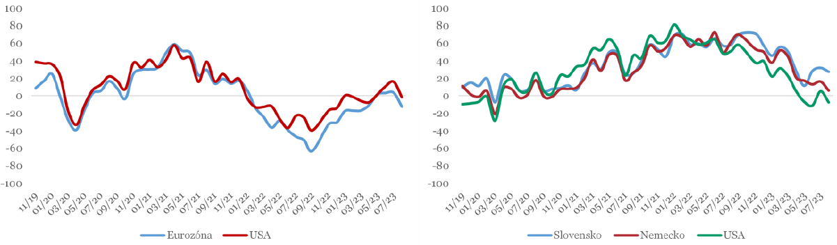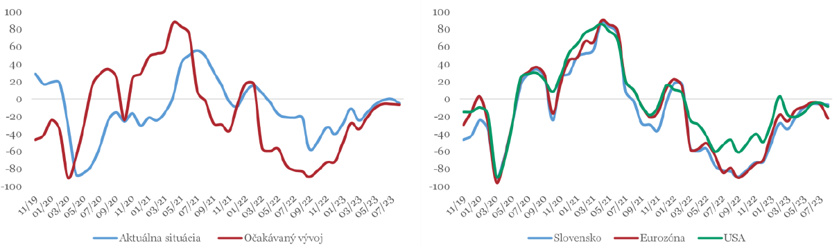Index ekonomického sentimentu* v mesiaci august mierne poklesol o 1b na -7b. (hranica medzi očakávaním zrýchlenia a spomalenia v horizonte šiestich mesiacov je 0b.). Augustový výsledok sa však stále drží na najvyšších hodnotách od februára minulého roku (t.j. od vypuknutia konfliktu na Ukrajine), no pozitívny trend vývoja indexu sa v posledných mesiacoch výrazne spomalil. Odôvodnenia respondentov ohľadom ekonomického sentimentu zostávajú poväčšine negatívne; väčšina zvolila rast úročenia (58%) alebo spomalenie zahraničného dopytu (52%), vysokú infláciu uviedlo 34%. Naopak jediné významné pozitívne odôvodnenie bolo ústup inflácie (48%). Aktuálny vývoj domácej ekonomiky je vnímaný o niečo lepšie, no jeho index tiež výraznejšie poklesol do negatívnej úrovne z 0b. na -5b. Podobný trend môžeme pozorovať aj u očakávaniach ohľadom ďalšieho vývoja pri ekonomike USA, ktoré taktiež poklesli o 4b na -9b., no pri eurozóne sme zaznamenali ešte výraznejší pokles až o 16b na -22b.