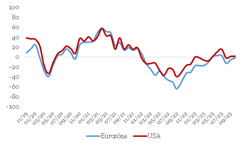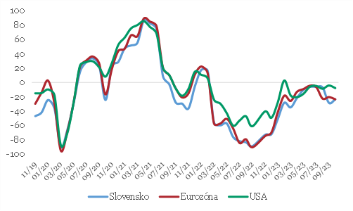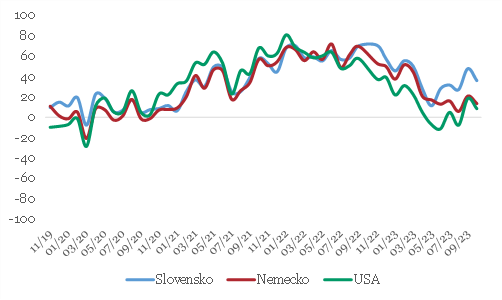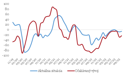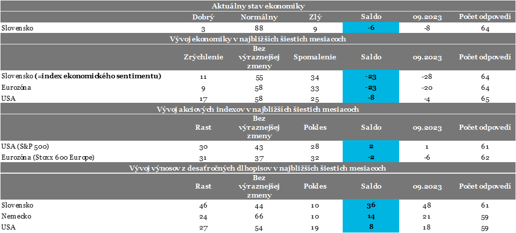 Index ekonomického sentimentu* v mesiaci október zostal aj napriek miernemu rastu o 5b na -23b. negatívny (hranica medzi očakávaním zrýchlenia a spomalenia v horizonte šiestich mesiacov je 0b.). Októbrový výsledok tak predstavuje mierne zotavenie po minulo mesačnom výraznom prepade, ktorý vymazal progres sentimentu dosiahnutý za posledné dva kvartály. Odôvodnenia respondentov ohľadom ekonomického sentimentu zostávajú poväčšine negatívne; väčšina zvolila rast úročenia (58%) alebo spomalenie zahraničného dopytu (49%), vysokú infláciu uviedlo už len 34%. Naopak, jediné významné pozitívne odôvodnenie bolo ústup inflácie (36%). Aktuálny vývoj domácej ekonomiky je vnímaný výrazne lepšie, jeho index taktiež mierne vzrástol o 2b. na -6b. Naopak negatívnu zmenu môžeme pozorovať u očakávaniach ohľadom ďalšieho vývoja pri ekonomike USA, ktoré poklesli o 3b na -7b. a eurozóne kde poklesli o 3b na -23b.