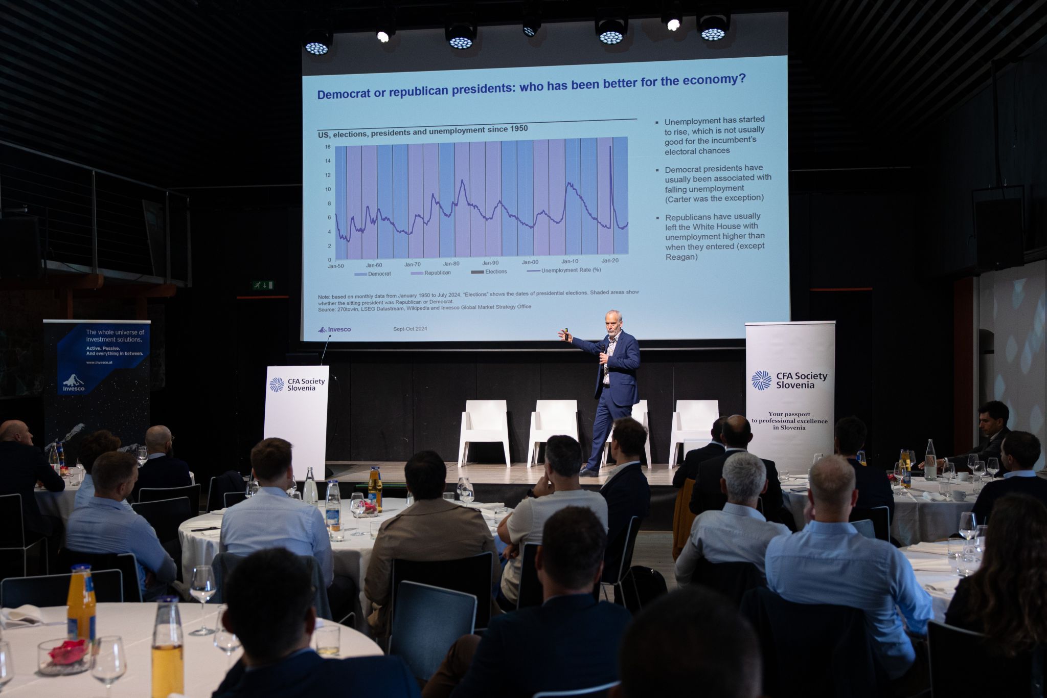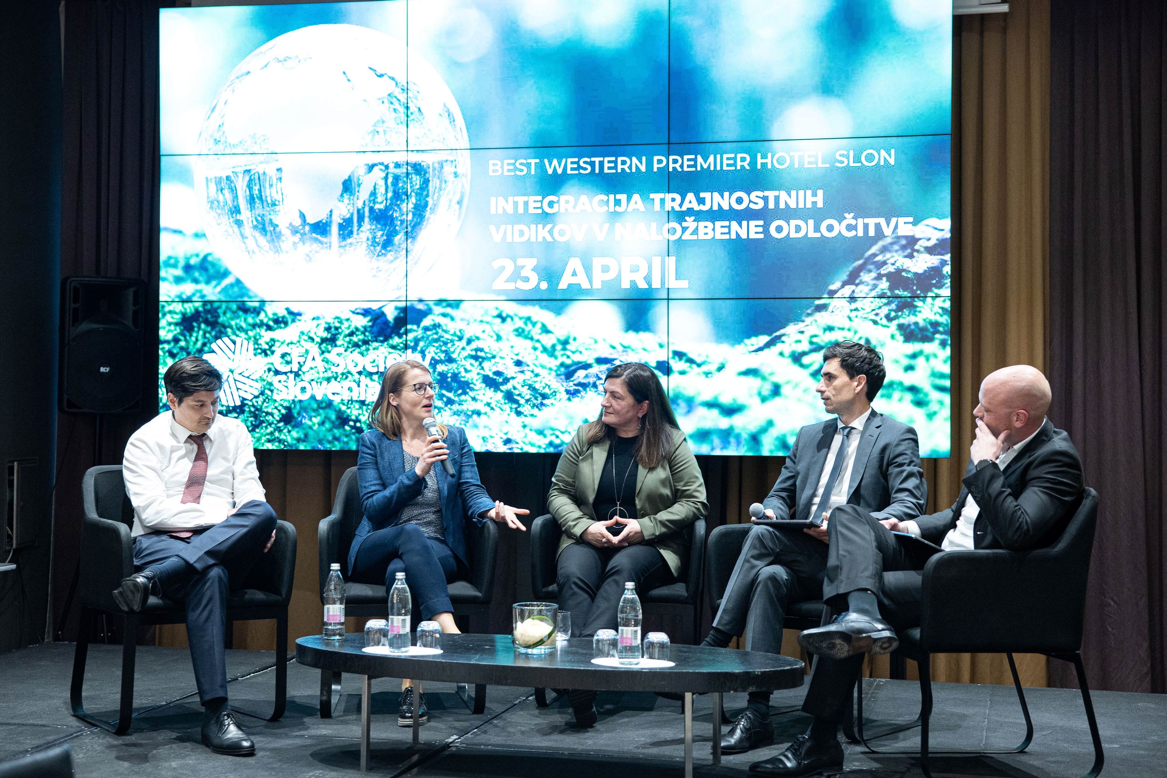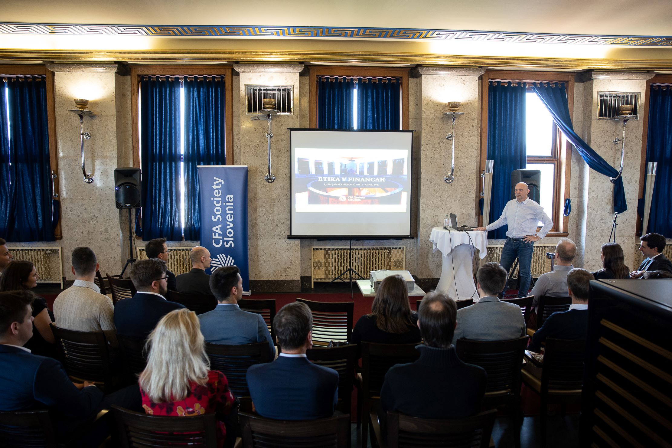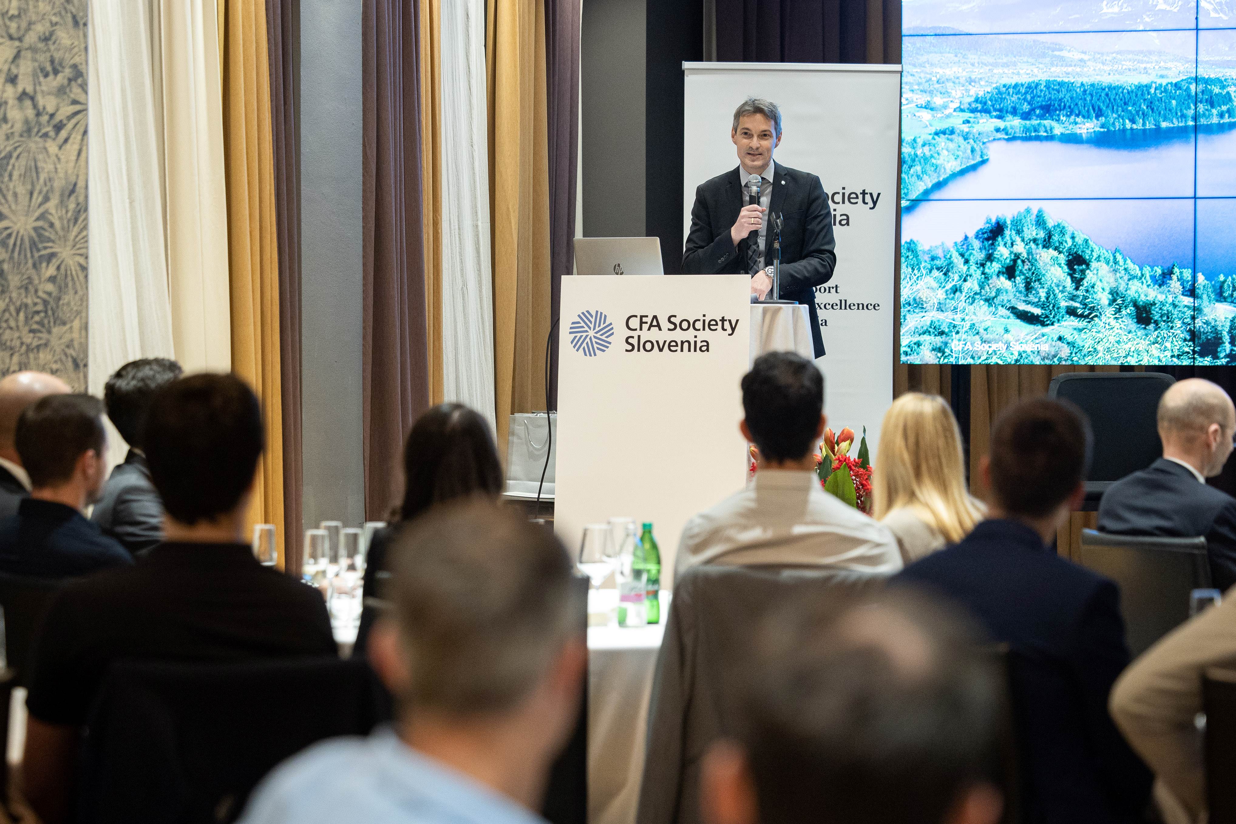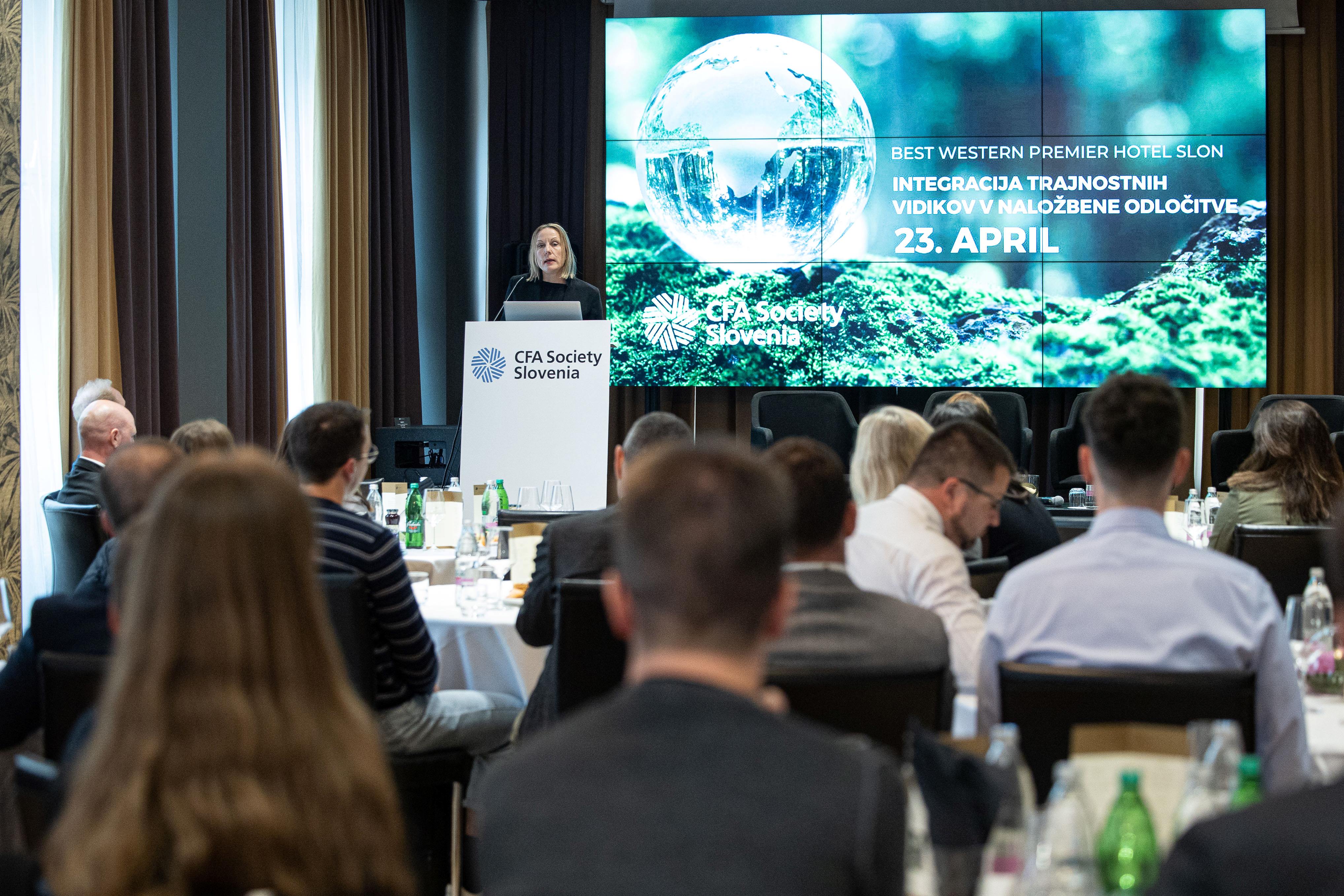 The event was held at the Best Western Premier Hotel Slon in Ljubljana on April 23rd, 2024. The discussion oriented around the practical aspects of integrating sustainability factors in the investment process, shedding light on both the opportunities and challenges associated with the approach. We were honoured to host distinguished speakers who enriched our discussion: mag. Tina Žumer, Vice Governor of the Bank of Slovenia; Dejan Goljuf, CFA, Bank of Slovenia; Gašper Dovč, Triglav Skladi; James Gloak and Elodie Houalla, BlackRock. The event concluded with the panel discussion on "Risk and Opportunities of Integrating Sustainability Factors into Investment Decisions", moderated by Andrej Petek, CFA, Triglav Skladi. The panellists included Tadej Mendiževec, CFA, CAIA, Sava Re; Silva Deželan, PhD, Forbion, Polona Močilnik, SID banka and Sašo Šmigić, CFA, Generali Investments.
